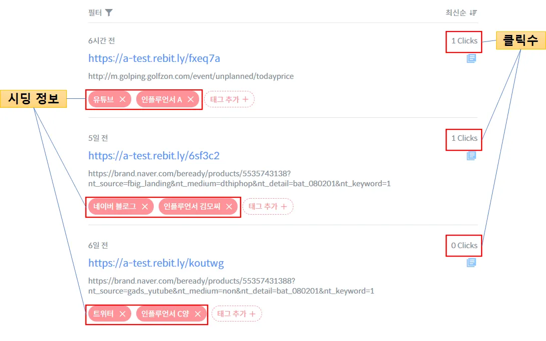 이처럼 Rebitly를 활용해서 링크마다 어떤 시딩인지 정보를 달고 어떤 곳에서 시딩 효과가 좋은지를 측정할 수가 있습니다.