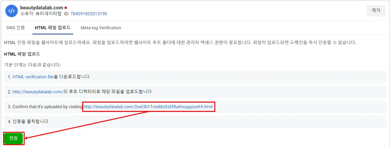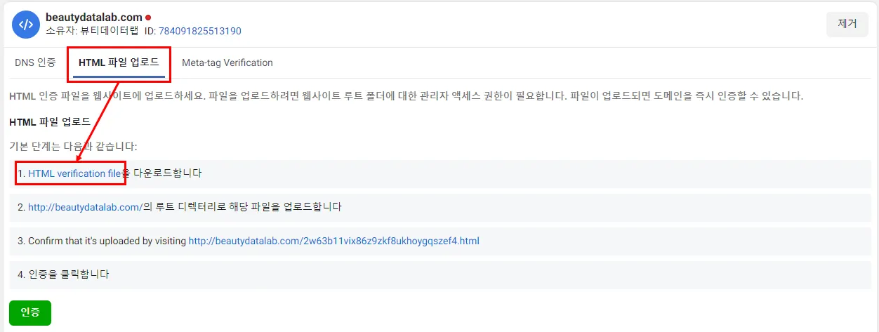 6. 다운로드받은 인증용 HTML 파일 업로드: