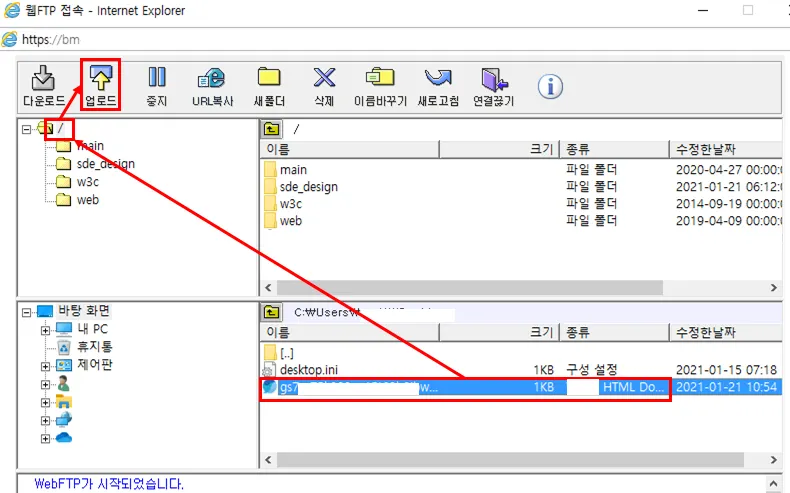 HTML 파일 다운로드 경로로 이동 → HTML 파일 클릭 → FTP 최상단 위치 선택 (" / ") → 업로드