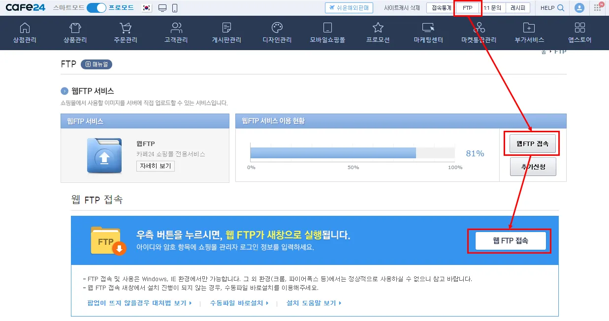 카페24 로그인 → 상단 메뉴중 "FTP" 클릭 → "웹FTP 접속" 클릭 → "웹FTP 접속" 클릭