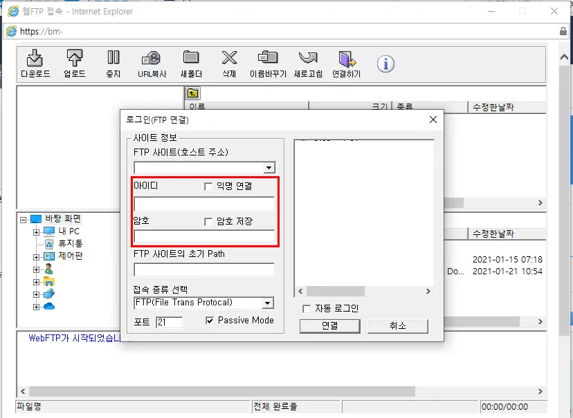5. FTP 서버 로그인: 카페24 관리자 ID & PW 입력