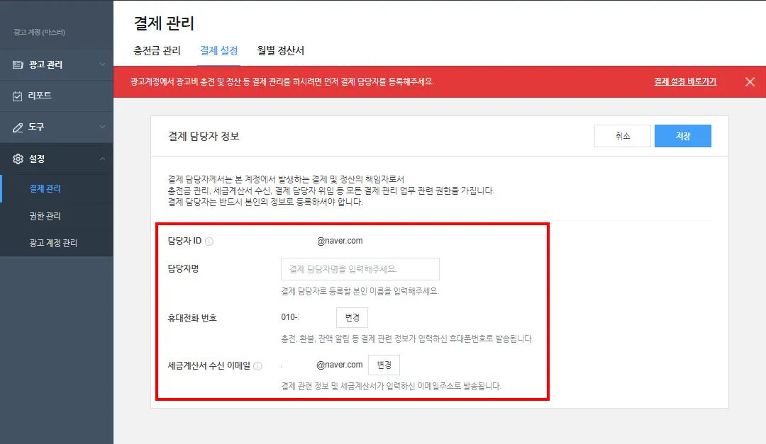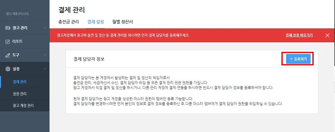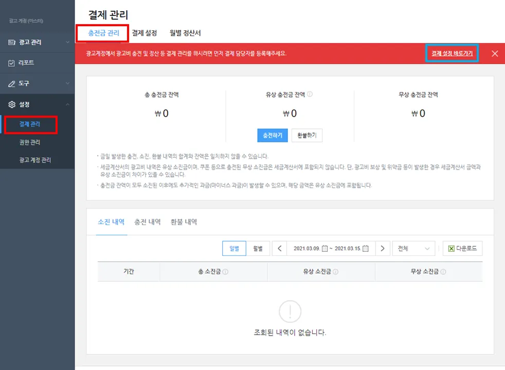 2.1 설정 → 결제 관리 → 충전금 관리 → 상단 빨간색 경고 배너 → 결제 설정 바로가기