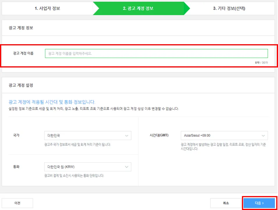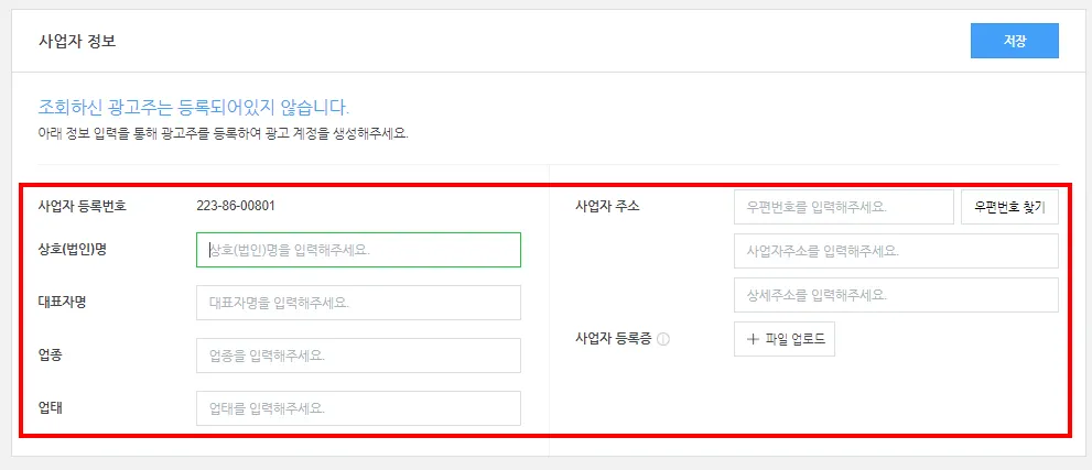 1.2. 사업자 광고주(법인/개인) → 사업자 등록번호 검색 → 미등록시 상세정보 입력 후 등록