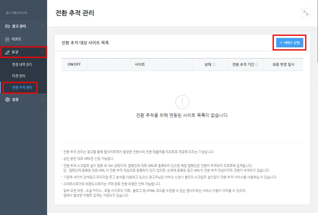 3.1. 도구 → 전환 추적 관리 → 서비스 신청