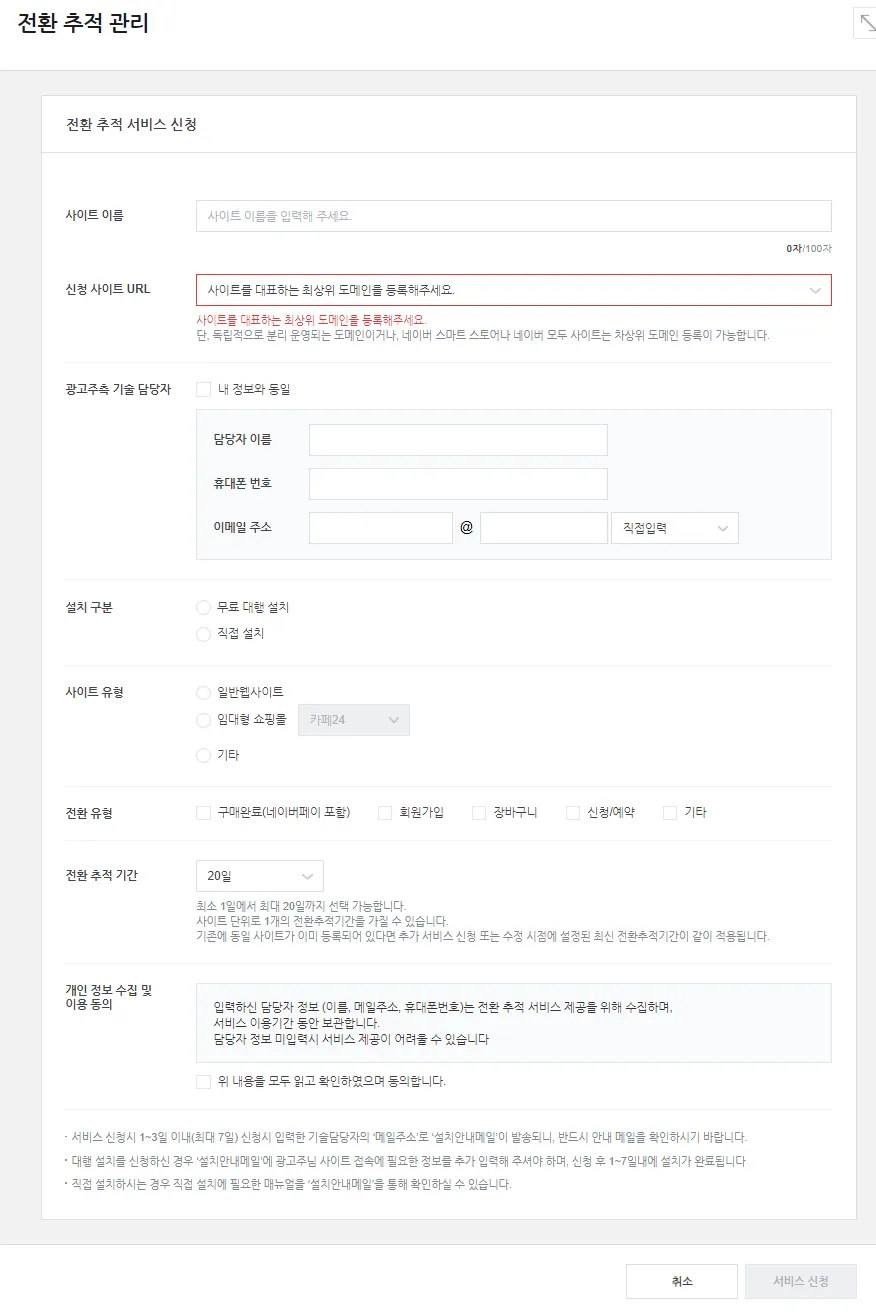 광고주측 기술 담당자: 추적 스크립트 설치 권한 보유 및 담당자 연락처 입력