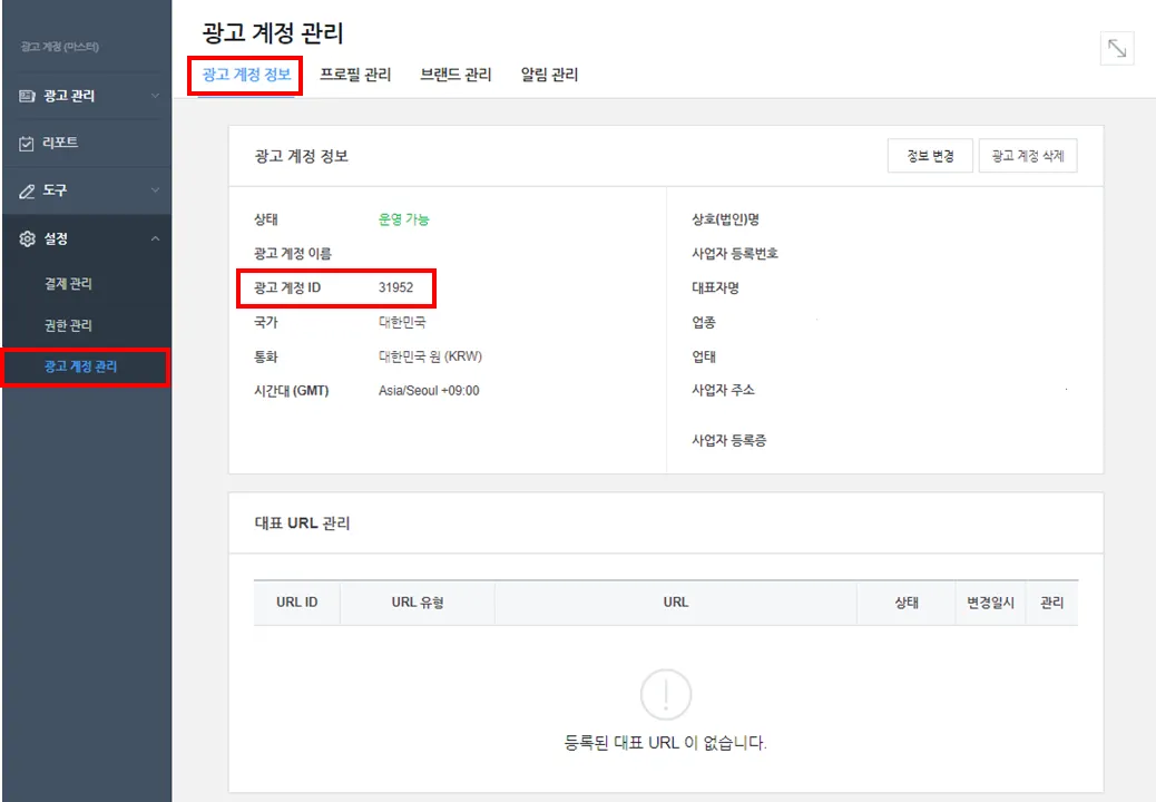 1.4. 생성완료 후 → 설정 → 광고 계정 관리 → 광고 계정 정보 → 광고 계정 ID 확인 및 공유