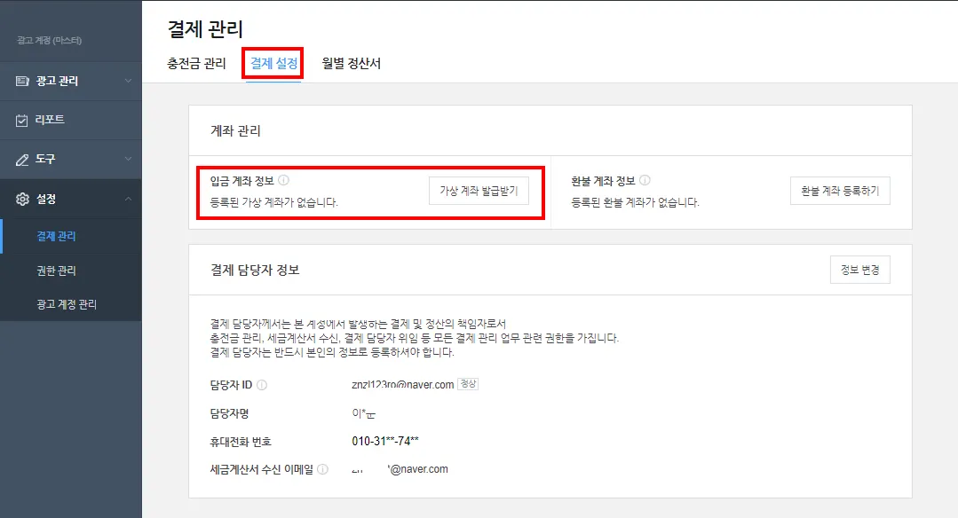2.4. 설정 → 결제 관리 → 결제 설정 → 입금 계좌 정보 → (입금용)가상 계좌 발급받기