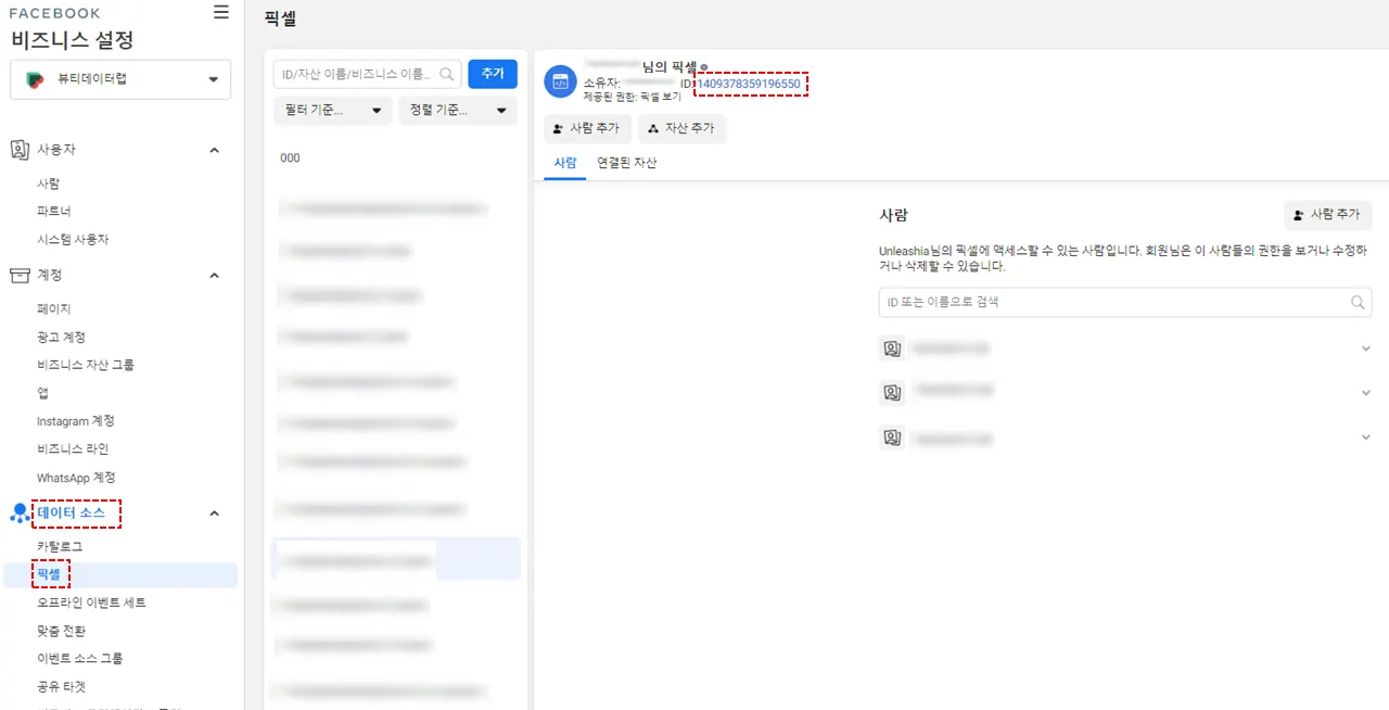 비즈니스 설정 → 데이터 소스 → 픽셀 → ID (빨간 박스친 부분)